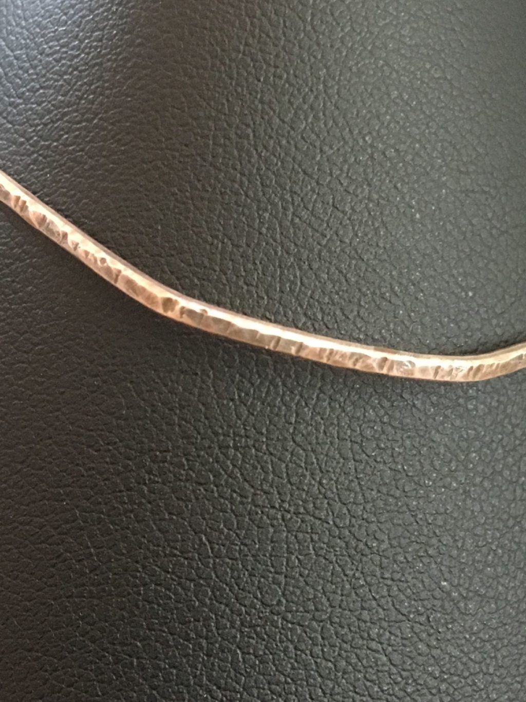 It can be made from either solid 1.5mm sterling silver wire, 2mm copper wire or 2mm bronze wire.  The bangle has been given a hammered and oxidised finish.